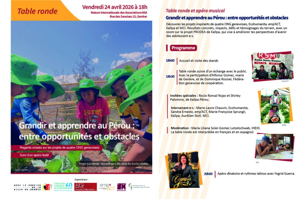Nous vous invitons à une table ronde consacrée aux défis et aux perspectives de l’éducation au Pérou, organisée par Kallpa Genève, emp’ACT, le MCI et Ecohumanita. Dans un contexte marqué par des inégalités persistantes, une crise politique et les séquelles durables de la pandémie, le système éducatif péruvien fait face à de nombreux obstacles — mais aussi à des initiatives porteuses de changement.